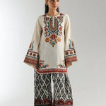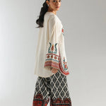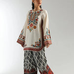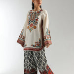 Shirt (Kameez): Off-white silk shirt adorned with intricate floral and ethnic inspired prints in vibrant shades of red, green, and mustard. The neckline and borders are beautifully detailed, with flared sleeves adding a graceful touch.